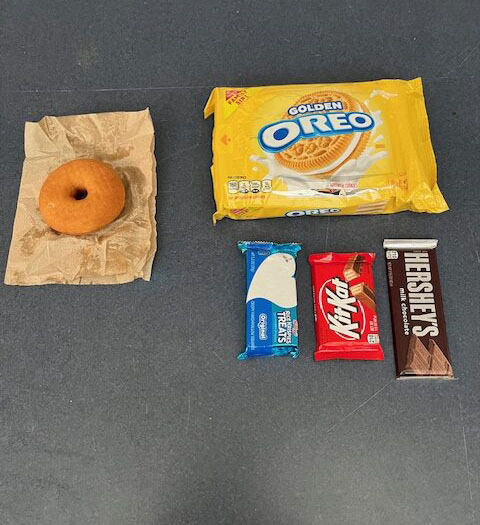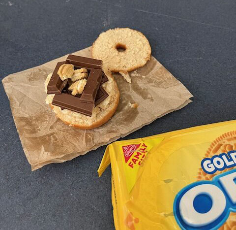 So you’re probably wondering what the absolute hell this is right!?! Well it’s a desert that I came up with back in high school as a way to sneakily have multiple candies and junk food types at once. But over the years my family has found it not only extremely funny, but tasty too, so we decided to make it a family recipe and give it a name that would only be spoken of in legend…THE ABOMINATION. Now I should mention that this is what I call the recipe, because I found the name funny, however my family has now dubbed this ” the loaded donut ” and it’s now a dessert where you just take a plain donut and load it with whatever sweet treat you want ( within reason obviously ) and then heat it up then dig in.